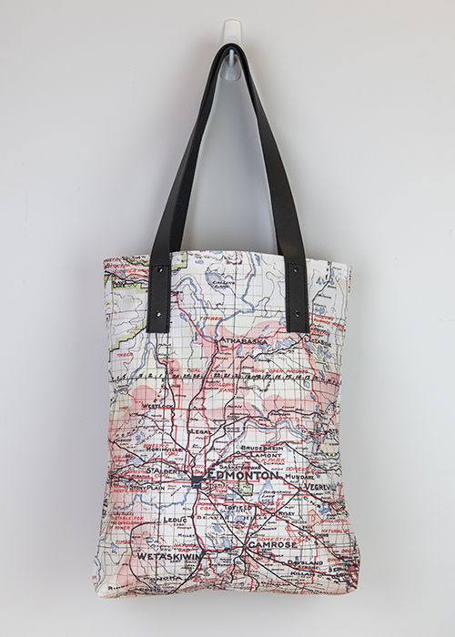 For all you cartophiles out there, this colorful item in the Achives Store is sure to please you! We have taken a bright map of Alberta from the PAA holdings and modified it to fit this urban tote bag. The image is repeated on both sides of the textured canvas exterior and is complemented by vegan leather straps and a brass magnetic closure. The cotton sateen lining and inside pockets make this convenient tote suitable for carrying school supplies, craft projects, or as an everyday carryall.