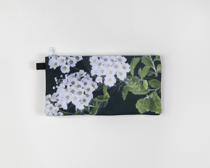 What wonderful things you could pack into this convenient zip case! While it is considered a pencil case, it would also be ideal as a case for carrying makeup, receipts, phone chargers, and small craft supplies. This medium-sized case has a textured canvas outer shell with a fabric loop at the side. A white zipper contrasts beautifully with the William Copeland McCalla image of Spiraea Van Houttei (or Bridalwreath) which is printed on both sides.