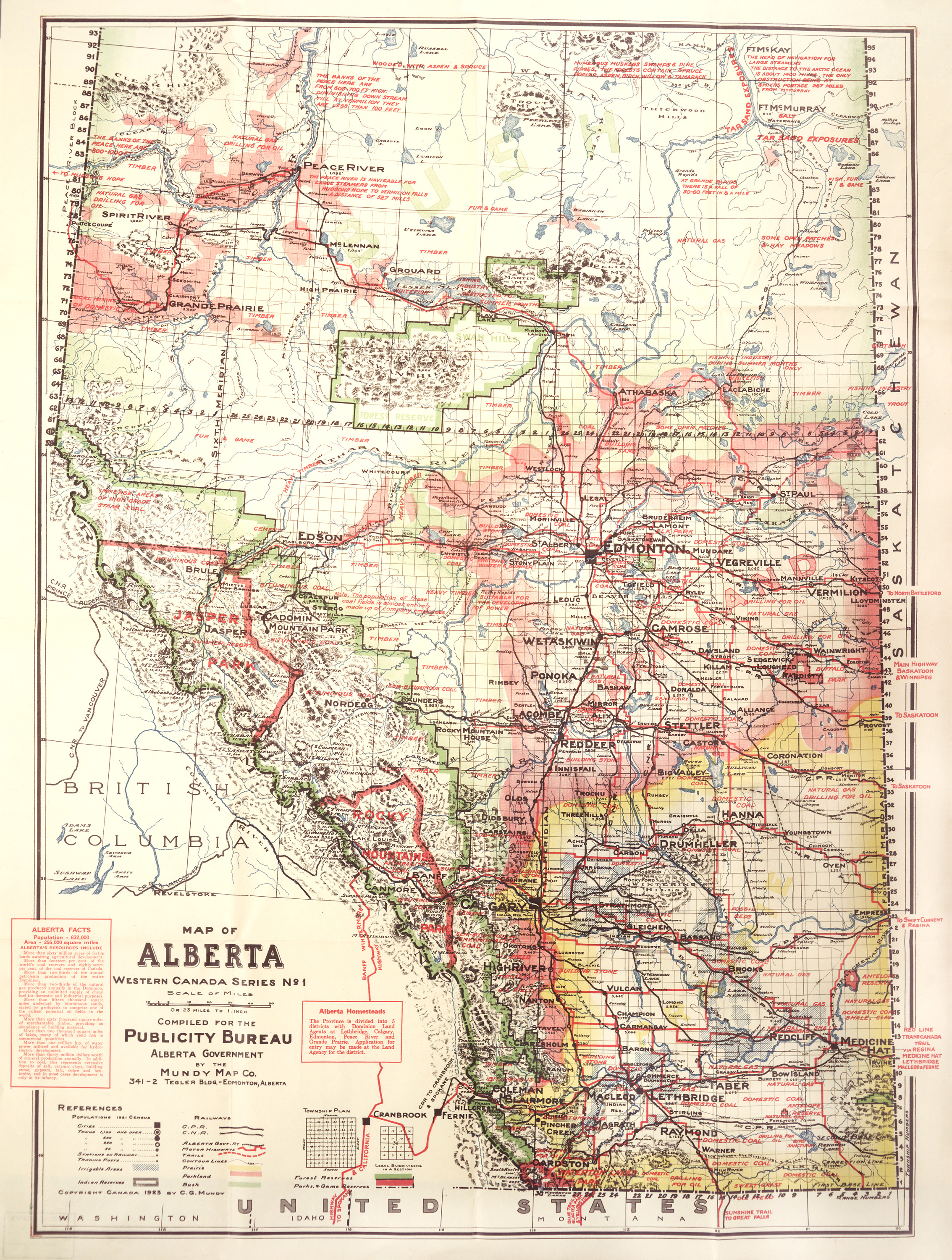 This colourful map of Alberta was compiled for the Alberta Government Publicity Bureau in 1923 by the Mundy Map Company of Edmonton.