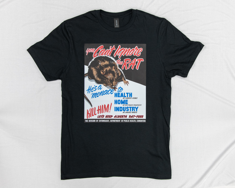 It's back! The PAA's famous Rat T-shirt is back in our Archives Store. The screen-printed image on these t-shirts is from a c.1948 poster released by the Alberta Department of Public Health which promoted keeping Alberta rat free.