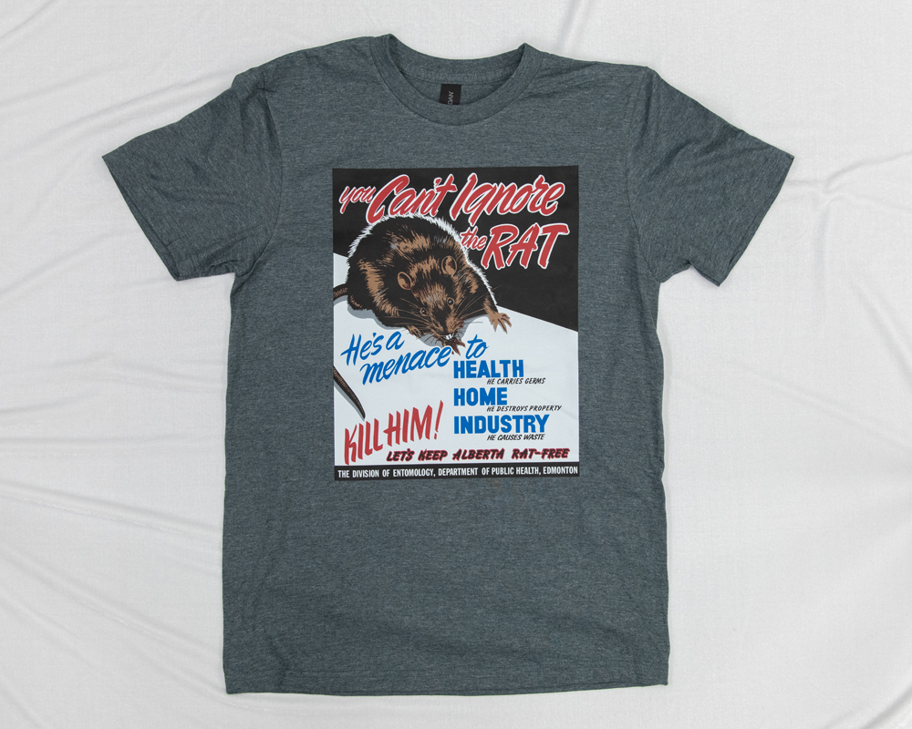 It's back! The PAA's famous Rat T-shirt is back in our Archives Store. The screen-printed image on these t-shirts is from a c.1948 poster released by the Alberta Department of Public Health which promoted keeping Alberta rat free.