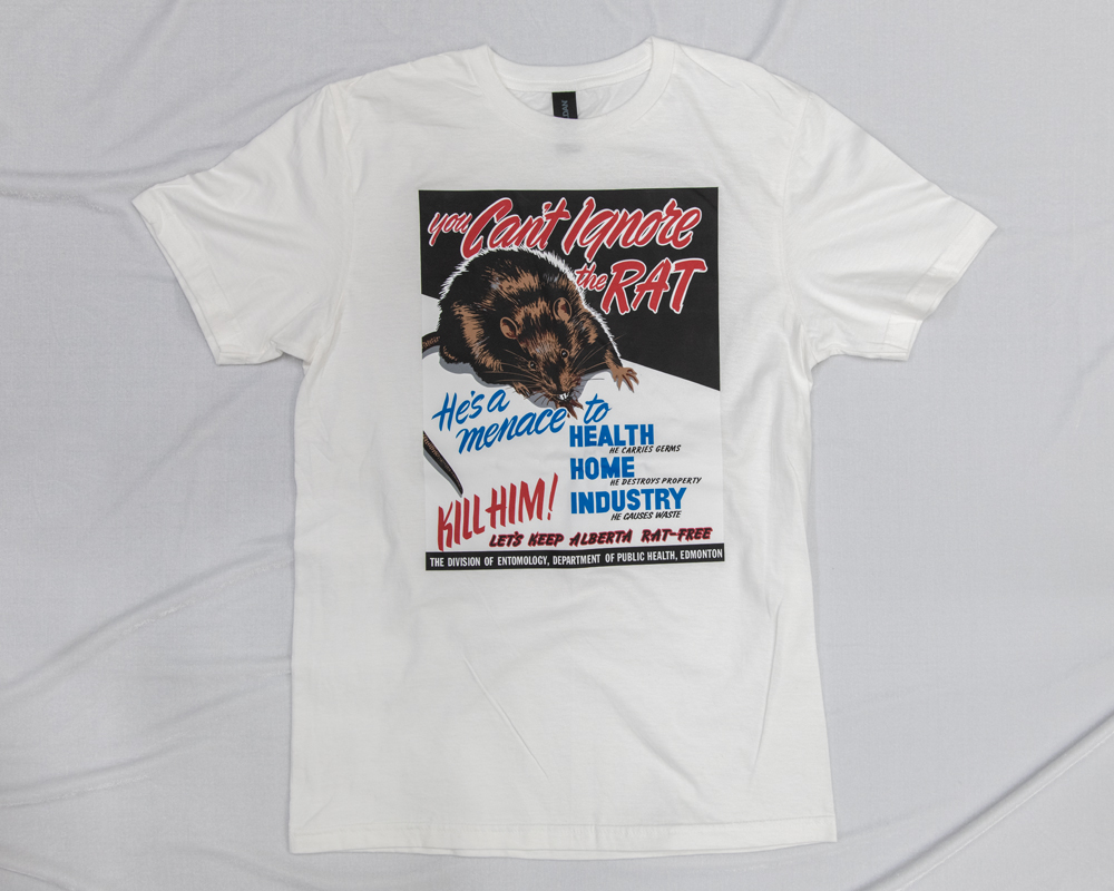 It's back! The PAA's famous Rat T-shirt is back in our Archives Store. The screen-printed image on these t-shirts is from a c.1948 poster released by the Alberta Department of Public Health which promoted keeping Alberta rat free.